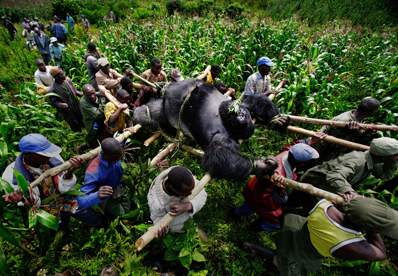 Conservation Rangers work with locals to evacuate the bodies of four Mountain Gorrillas killed in Virunga National Park, Eastern Congo (July 2007, Bukima, Democratic Republic of Congo), from the series ‘A violation of Eden’, Brent Stirton. Courtesy Brent Stirton ©Prix Pictet Ltd 2015