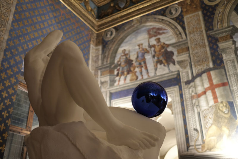 The following morning, in the Palazzo Vecchio’s grand Sala dell’Udienza, the artist was presented with the keys to the city, following an elegant speech by the city’s 39-year-old mayor, Dario Nardella. All guests were then ushered through to the adjoining Sala dei Gigli where the 2013 Gazing Ball (Barberini Faun) – a second Koons piece, also selected by the artist – is on show until 28 December. The bright blue reflective sphere placed on this plaster cast of the celebrated erotic antiquity mirrors not only its viewers, but also Donatello’s monumental bronze masterpiece Judith and Holofernes as well as Ghirlandaio frescoes nearby. Koons is nothing if not fearless to invite comparison with the greatest of all Renaissance artists.
