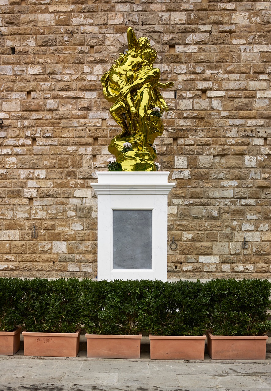 Koons’s ‘Pluto and Proserpina’ joins Michelangelo’s ‘David’ outside the Palazzo Vecchio in Florence. Photo: Lorenzo Valloriani