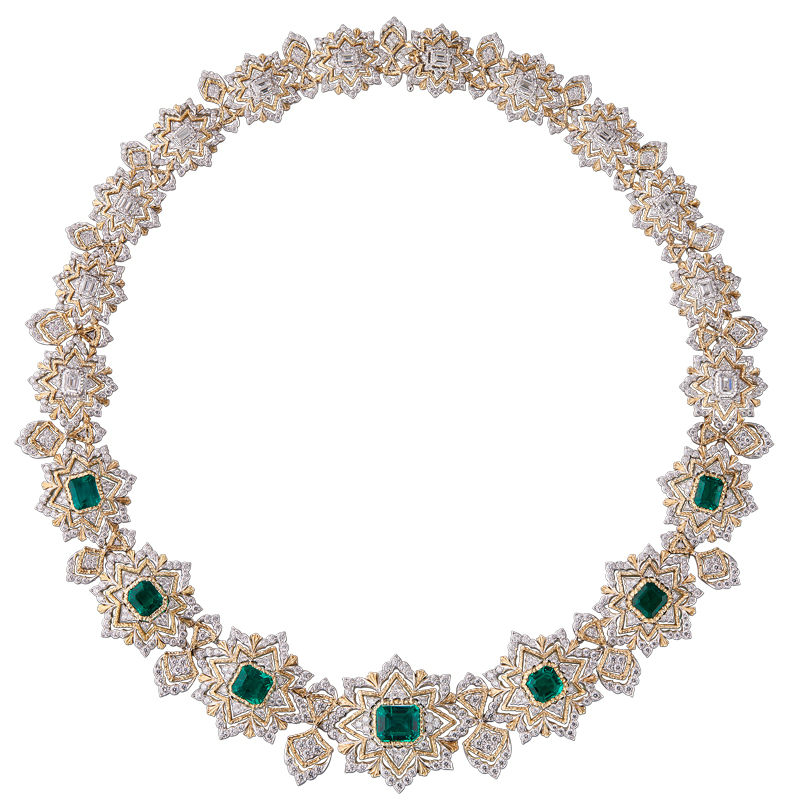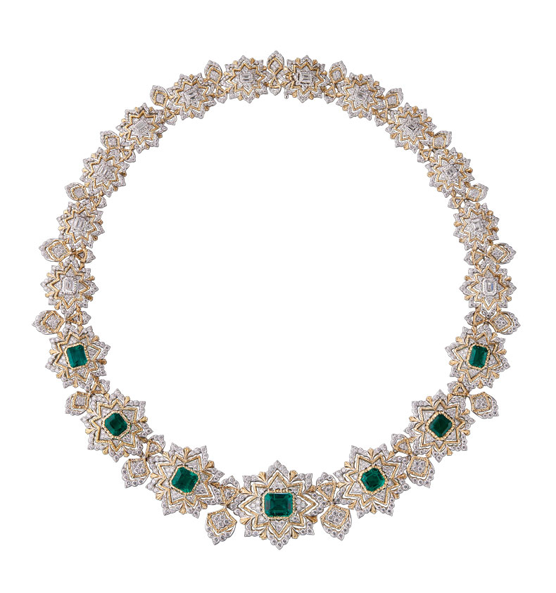 The way the emeralds are set in the Mosaico necklace is a Buccellati signature. Rather than being held by prongs, the gemstones are nestled directly into the metal, which is modelled into a cylindrical form that gently yet securely holds each stone. The surrounding gold is decorated using Buccellati’s signature engraving techniques, allowing the setting to blend seamlessly into the piece as a whole. ‘These emeralds, of the finest and rarest quality and colour, sourced from Colombia, have been in our family for quite some time, until they inspired me to bring them together in this necklace,’ Andrea Buccellati tells me.