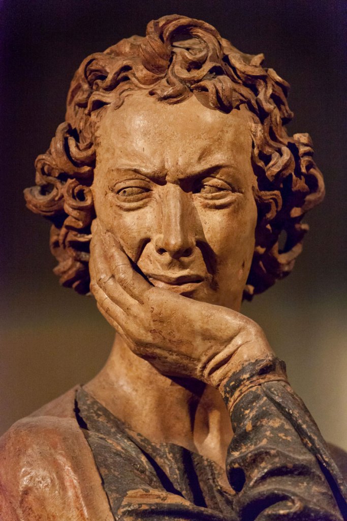 Mourning can be both culturally specific and woefully individual. The figures in Niccolò’s set of sculptures appear to be exclaiming their grief in entirely different ways. It is one of the many fascinations of the work that grief seems to be progressive from left to right, as though the viewer is reading a story of escalation. This reading, though, is undermined by the central figure of John, who looks more muted, his head resting in his hand in what might be disbelief. But the longer I looked at the figure of John, the more quietly devastating it became. The stillness contained in the figure at the centre of the terracotta audience suggests a response welling up through the clay. It is, in some ways, the most naturalistic aspect of these all-too real and all-too gothic works, while also animating a profoundly religious idea that through this particular grief comes the promise of life.
