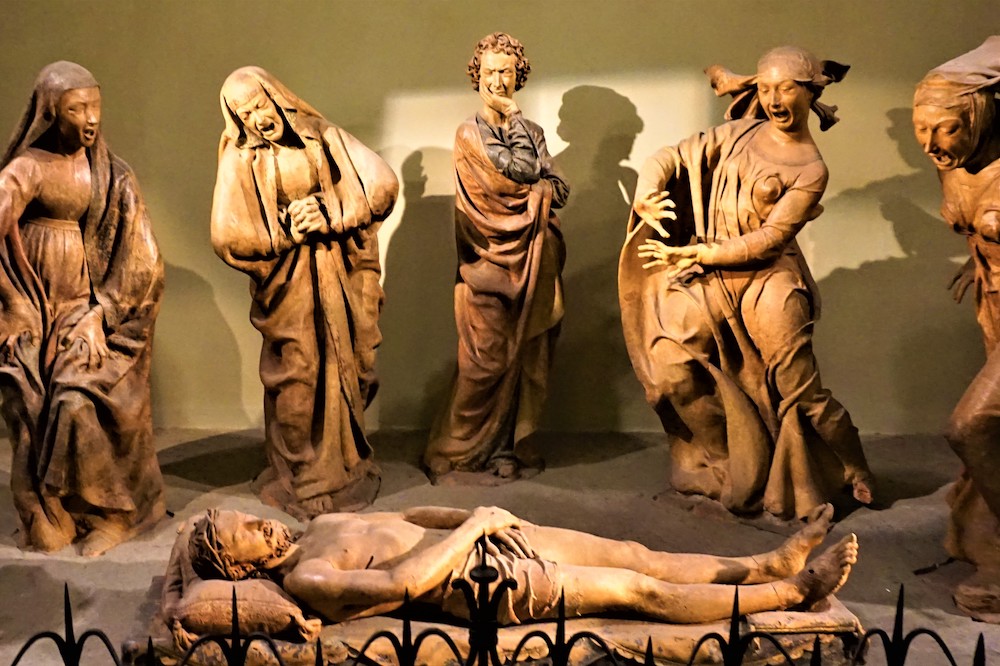 Niccolò’s Lamentation occupies a corner of the Church of Santa Maria della Vita in Bologna. The work comprises seven figures in terracotta. Lying at the centre of the composition is a dead Jesus. He is surrounded, as is typical, by the Virgin Mary and the three Maries. Less typical is the presence of Saint John and a figure variously identified as Joseph of Arimathea or Nicodemus – the hammer in his hand unhelpfully lends credence to both identities. The figures are roughly life-sized, forcing the viewer to take seriously and realistically what is depicted. (The oratorio of the church confirms that softness is not something this church is interested in. Its ceiling contains wooden putti carrying leather whips that hang down towards the floor to show the order’s commitment to self-flagellation.)