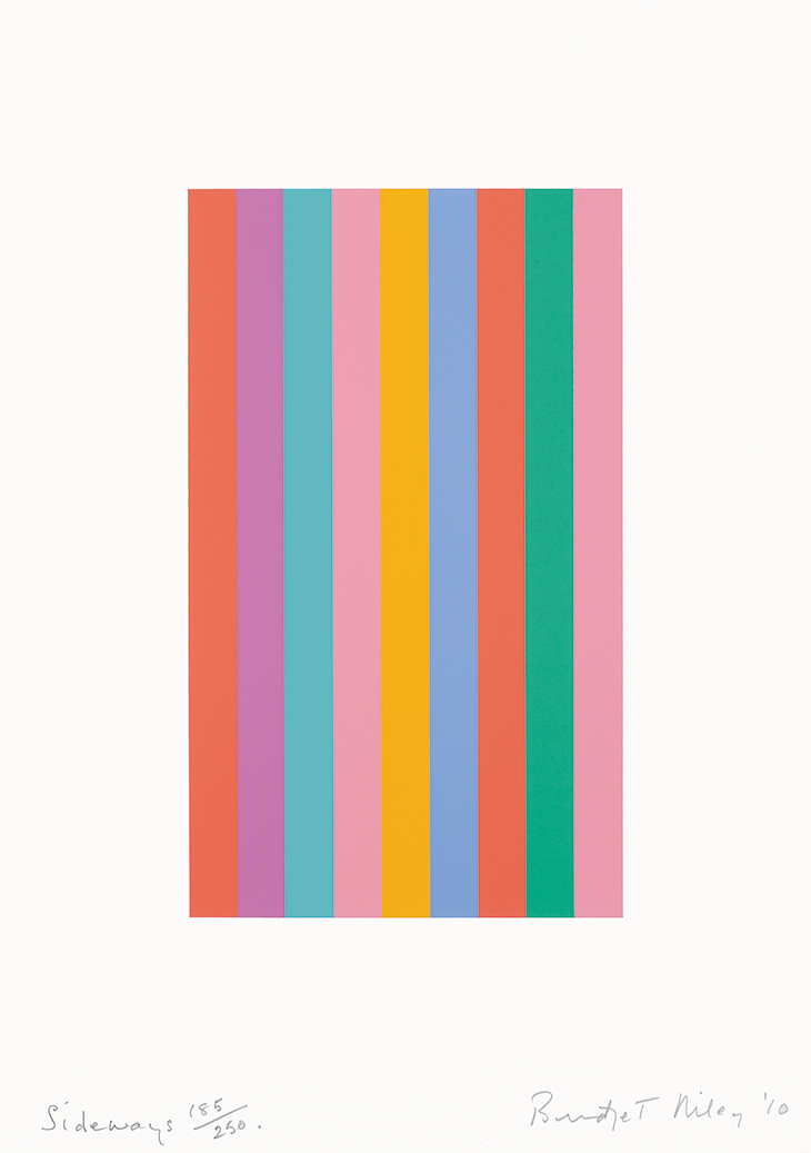 Since then, Riley’s ability to create colour relationships that release shimmering sensations of light and hazy after-effects has proved effective both in her paintings and prints. Clarity of purpose has always been to the fore in her art, but in the last decade Riley’s return to the stripe has felt like a return to first principles. In the small print Sideways (2010), composed of nine stripes identical in size and placed close together, the vertical alignment is offset by the way the eye moves back and forth across the image, owing to the intense attraction of the seven colours and their relation to each other. Its absolute certainty is invigorating.