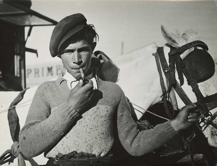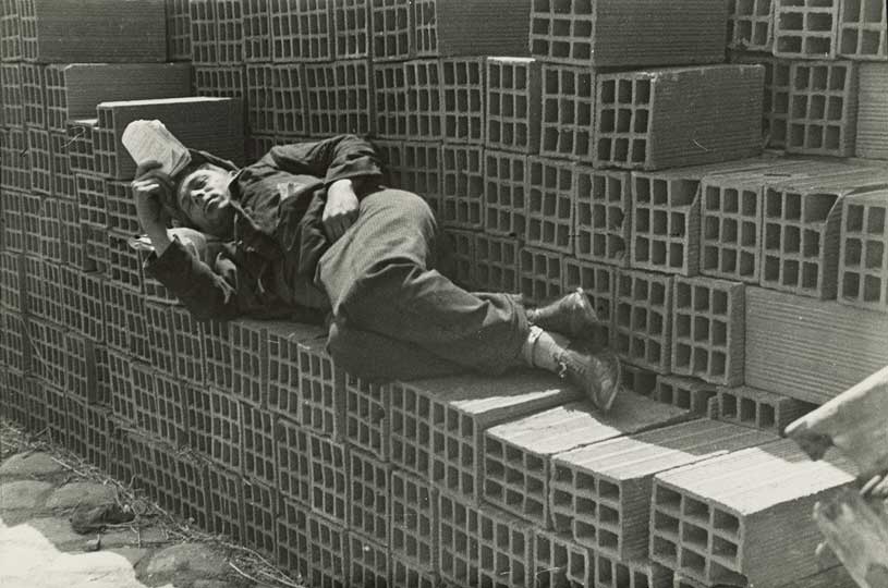Krüger’s Paris photographs from 1935 reveal a young woman revelling in the smaller freedoms that had become part of her new life: tea crockery sets stack up, vinyl records fill a frame, and bunches of succulent fruit are the focus of another. Yet her captures of people are the more compelling and reveal the German’s deep-seated compassion for humanity. One man lazily lies reading upon a pile of bricks, a labourer cheekily grins at the camera, whereas Hungarian writer Charles Sirato ponders meditatively – just one of the exiled European intellectuals that she recorded, alongside Dr. Kurt Rosenfeld and trade unionist Gustav Faber.