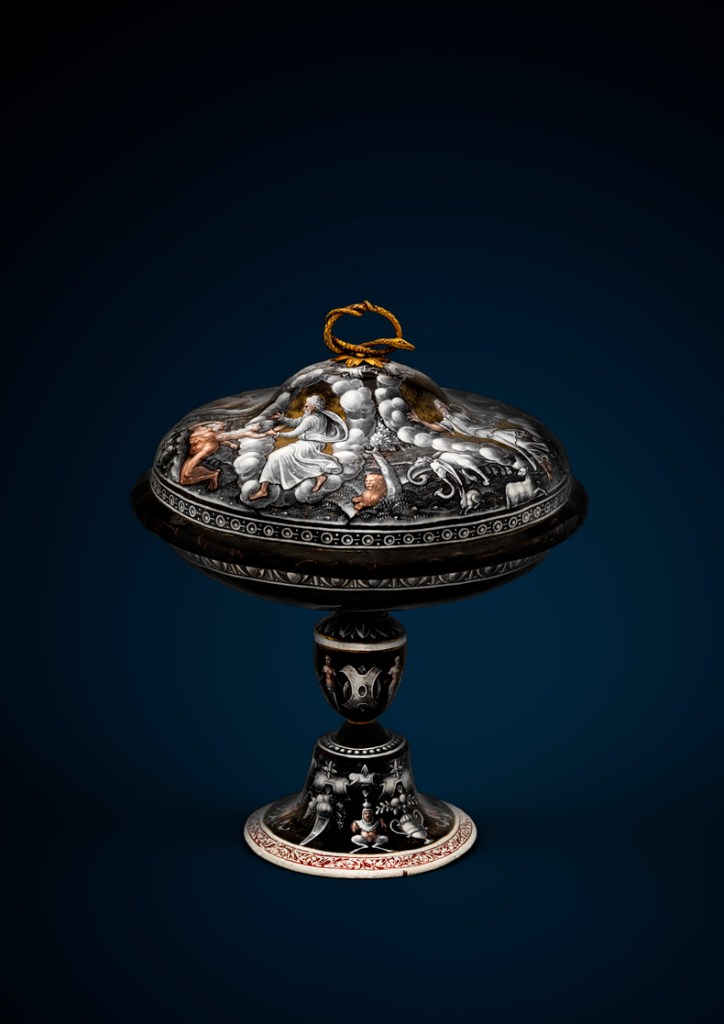 ‘Immarcescible’ brings together not only plaques and portraits but also tazze, ewers, footed cups and covers, candlesticks, spoons and salts. Apparently unique among them – and arguably the most delectable piece on show – is a small cylindrical box with silver-gilt mounts vividly but delicately painted with scenes of Diana and Actaeon, the former bathing, the latter already turned into a stag. The cover depicts the Abduction of Helen; its base, a boar hunt. There is much else to charm and impress, from the Pierre Reymond cup decorated with an allegory of wine and Jean de Court’s cups with Moses striking the rock and Noah’s flood to Couly Nouailher’s bad-tempered horses. Also included among the 72 exhibits is a piece by one of the few women enamellers, Susanne de Court, no doubt the daughter of Jean. Prices range from a relatively modest €10,000 to more than €1m, but everyone who visits the gallery can feast freely on this illuminating show.