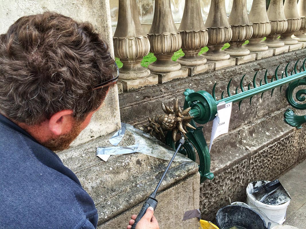 The restoration is as remarkable for the care and precision that has gone into it as its finished appearance. The layers of paint on the railings, fine examples of early 19th-century ironwork, were analysed in order to find their original colour, a bronze green and gold for certain elements. The railings were repainted in that green, originally aimed at imitating patinated bronze, while the wavy spikes topping them and large pineapple finials were highlighted with gold leaf. The coffered ceiling, adorned with a cornucopia of pineapples, melons, grapes, and apples, in such abundance that they seem to be almost bursting out of their frames, was restored, cleaned and consolidated. The same goes for the frieze spanning all round the top of the walls of the portico, depicting a playfully intricate combination of putti and their dogs chasing stags, boars and other wild animals amidst a lush stylised foliage of acanthus leaves. The museum produced a series of panoramas before taking down the scaffolding allowing the viewer to fully appreciate the virtuosity of the design.