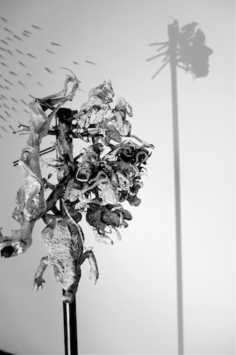 With the aid of a projector, Noble and Webster’s shadow sculptures transform what appear to be abstract assemblages into figurative shadow portraits. In this piece, especially created for this year’s Masterpiece London, the artists have worked in silver for the first time, welding together casts of small dead animals such as rats and frogs.
