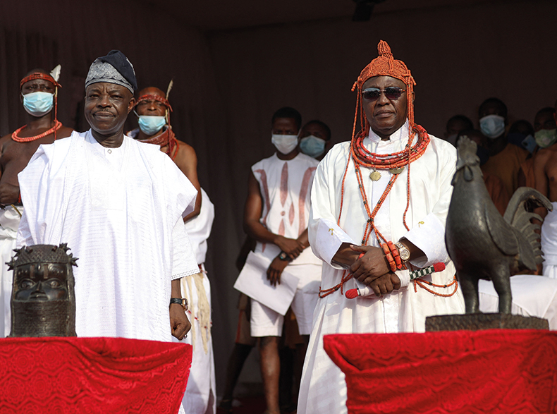 As plans for the new museum began to take shape, Obaseki brought in Ihenacho, a wealthy and well-connected friend from out of state, to raise money. Ihenacho in turn brought in his friend, the Anglo-Ghanaian architect David Adjaye. In late 2020 they gave the museum a new name: the Edo Museum of West African Art (it subsequently dropped the ‘Edo’). The new name, Ihenacho says, reflected the fact that it was born out of a ‘broader vision’ and was always meant to include contemporary art. This vision, it seems, was not shared by everybody. The museum would be run by an independent trust and not be under the sclerotic control of the Nigerian government’s National Commission for Museums and Monuments (NCMM). This reassured European institutions but, to the Oba and his supporters, it suggested they were losing control of the process. By March 2021, the Oba was expressing his unhappiness and in the following months any veneer of unity was shattered when he denounced the management of the museum as ‘an artificial group’ seeking to ‘divert’ the return of his ancestor’s artefacts. The ‘right and only legitimate destination’ for the Bronzes was the originally conceived Royal Museum, he said.
