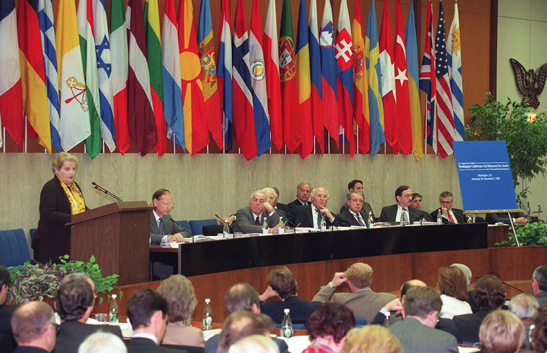 US Secretary of State Madeleine Albright addressing the plenary session of the Washington Conference on Holocaust-Era Assets in Washington, D.C. in 1998. Photo: Tim Sloan/AFP via Getty Images