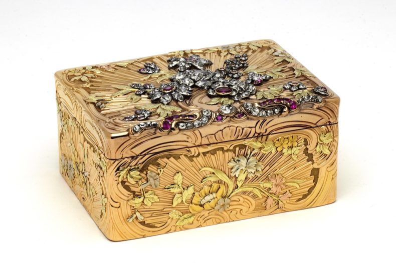 Snuff box with sprays of flowers against sunburst (1755–56), made by Jean Ducrollay, Paris. Victoria and Albert Museum, London