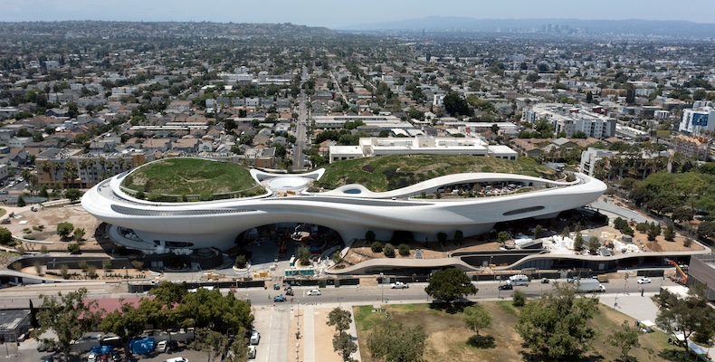 View of the Lucas Museum under construction, July 2025. Photo: Sand Hill Media/Eric Furie; © 2025 JAKS Productions