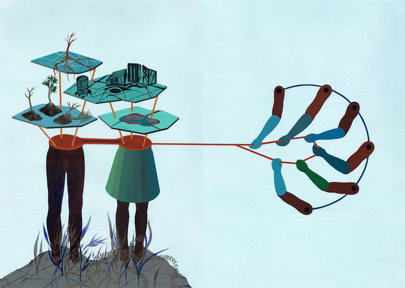 The beauty of Nkanga’s work lies in its refusal to romanticise violent histories while offering glimpses of the potential for repair and renewal. In her series Social Consequences (2009–ongoing), the mechanical limbs reappear in further depictions of exploitative labour, but also in sensual colour images such as Earthing (2021) and Underneath the Shade (2022). Still, despite hinting at the possibility of metamorphosis, these surreal images hark back to the limbs piled at the bottom of the ocean as the figurines’ arms are punctured by the large black dots that accumulate in Nkanga’s imagery. The presence of these dots is ambiguous: do they represent holes or pins? Wounds, or joints?
