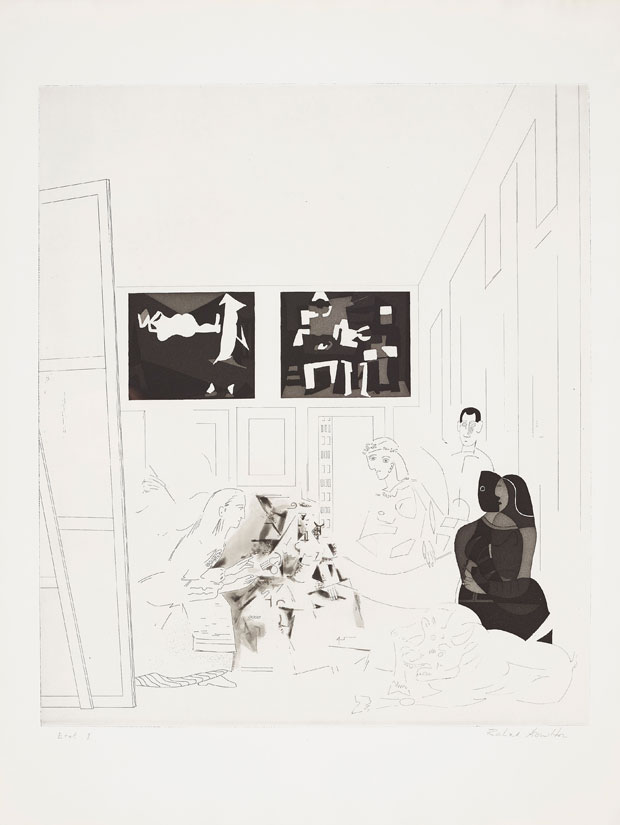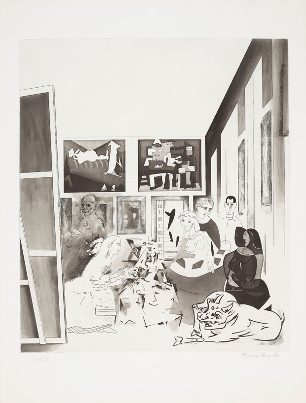 Another tour-de-force homage is Richard Hamilton’s Picasso’s Meninas of 1973. Picasso’s scrutiny of Velásquez’s masterpiece had led to some 44 works of art. Hamilton had seen Las Meninas at the Prado in 1972. He wrote: ‘The temptation to paraphrase Velásquez in Picasso’s styles proved irresistible…Las Meninas provided an opportunity to run the gamut of Picasso’s ‘periods’ in one plate – from ‘Rose’ through ‘Analytical Cubism’ to ‘Primitive’ to ‘Neo-Classical’ and so on…and the mysterious ambiguities…allowed some narrative interplay with substitutions of personalities as well as styles.’ Picasso has been substituted for the self-portrait of Velásquez working at the easel, the cross of St James on his chest replaced by a Communist hammer and sickle, and two of his paintings now decorate the back wall. In the doorway, instead of a watching Philip IV and his consort, Hamilton has inserted himself and his girlfriend, executed in a particular etching technique invented by Picasso.