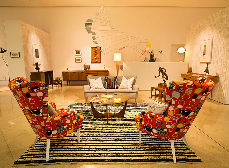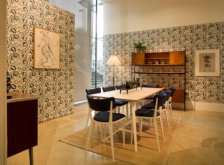 The shows were aesthetically coherent because there was a strong shared visual language between art, interior design and architecture at the time. Furniture designers were responding to smaller more compact living spaces, and sculptors were working within the same constraints. As Polly put it, ‘in the ‘50s you see this amazing crossover that you can’t really pinpoint to any other time. In terms of a visual language – in this case, heavy mass supported by spindly legs – you see it in the sculpture, the architecture, and the furniture design, and it seems to be really coherent and strong.’ There was also a very collaborative approach, with artists commissioned by manufacturers to create designs for textiles or wallpaper, such as Geoffrey Clarke’s wonderful Paintings for Textiles, three of which are on display at Pangolin.