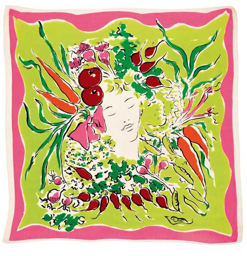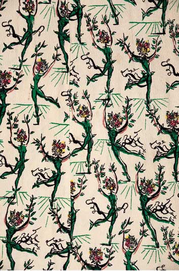 Raoul Dufy’s charming, whimsical patterns from the 1920s open the show, incorporating everyday objects and activities (Les Violins; Le Tennis). Dufy’s quirky designs paved the way for the Surrealists Salvador Dalí and Marcel Vertès, who collaborated with the American designer and entrepreneur Wesley Simpson in the 1940s. Dalí’s Desert Rocks (1947) and Vertès’ Radishes (c. 1945) are unexpected interpretations of common objects, perhaps reflecting a need after the Second World War for a new way of life and a perspective that could embrace both the accessible and the unfamiliar.