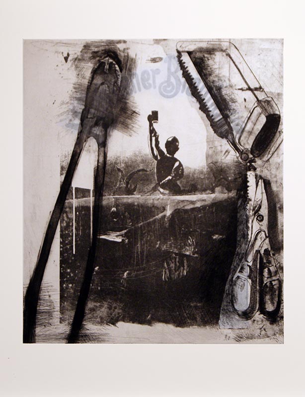 Dine manipulated the original stones by drawing and grinding copper plates to go over them, using many figures that recur throughout his work since the 1960s: hammers, saws, nuts and bolts… do you notice a pattern here? These are precisely the kind of implements that appeared on Soviet flags and posters, and Dine is well aware of it. He makes pairs of pliers suggest any number of Eastern Bloc-related icons – they resemble the towers of the Kremlin, the giant TV transmitters the Russians built across Eastern Europe, or even nuclear missiles.