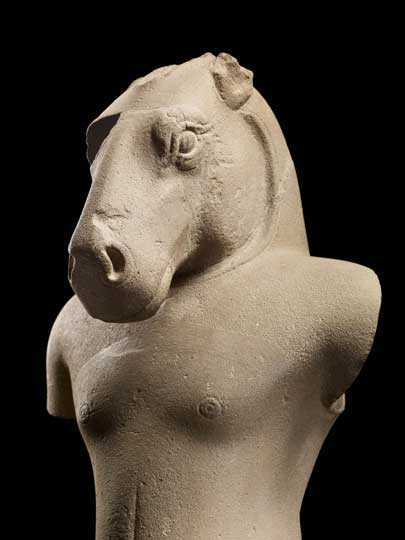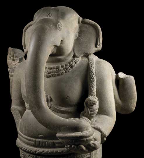 The Chinese had plenty of trading and monastic relations with the region, but in terms of culture this is, above all, a tale of Indian influence. Indian monks, sailors and merchants braved the Bay of Bengal waves to introduce the philosophies, rituals and artistic blueprints of Buddhism and Hinduism to Southeast Asia. Each kingdom, it seems, mixed this cultural basket of goodies with existing animistic beliefs to develop their own sculptural styles, their own cults. One was Ganesh as the powerful and dangerous Ganapati (represented here by three dynamic sculptures); another was Vishnu’s final avatar Kalkin (a monumental, sleek horse-headed figure from South Cambodia is on display); still another is Krishna raising Mount Govardhan (as seen in the almost Hellenistic, over life-sized, humanist figure found in a rock-cut cave at Phnom Da in 1944).