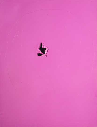 There, on the wall opposite us, hung the canvas itself, punctured with an elegant spiral of holes, part of the exhibition ‘Lucio Fontana: Rediscovery of a Masterpiece’ (open until 21 June). The whole event seemed faintly ludicrous. How, I wondered, could everyone take these art works so seriously? Once you have punctured one canvas, what can you gain, conceptually, from puncturing another? For today it seems they have become no more than a multi million pound must-have for every aspiring modern and post-war collector. La Fine di Dio (1963), a gilded pink egg-shaped canvas with large torn holes, realised $20,885,000 at Christie’s New York last November.
