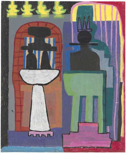 Work from the 1960s and early ‘70s is tentative, transparently in thrall to Cubism and Op-Art. But already, there’s something distinct about them; in 7 Bathing Hut, for example, black rectangle frames and tight scribbles of crayon at different angles suggest something kinetic and unstable, reminiscent of the frenzied bustle of a nightclub.