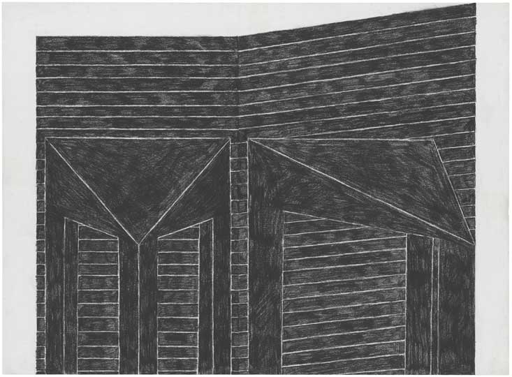 Barlow proceeded to refine this sense of movement into something slow, deliberate and altogether more impressive. A series of heavy black and white shapes made between 1977 and 1981 have the menace of a boa constrictor advancing slowly towards its prey. Looking harder to try to fathom why this is, it becomes clear that every single stroke of charcoal is as considered and methodical as a scientific diagram.