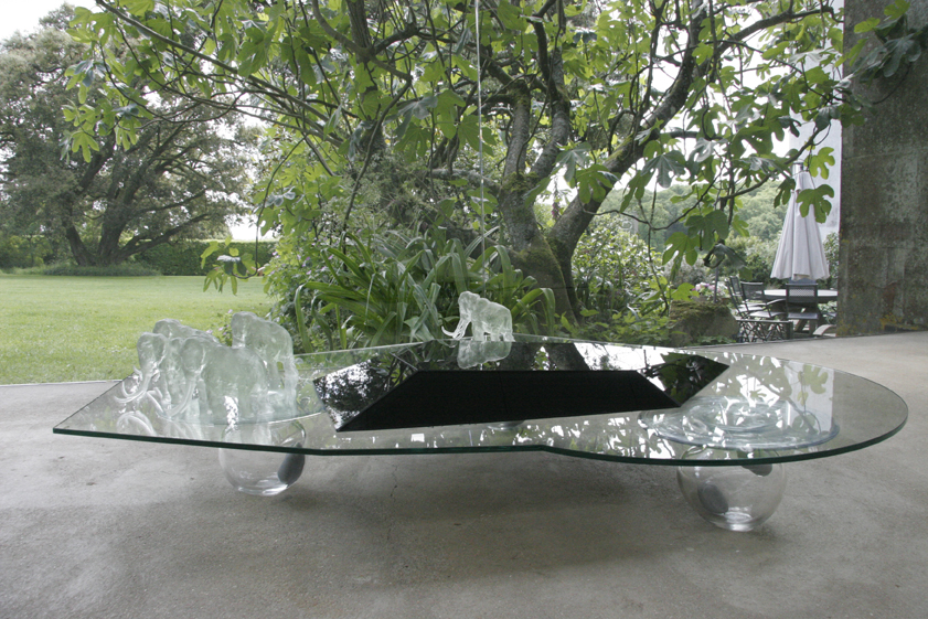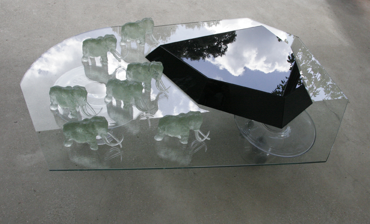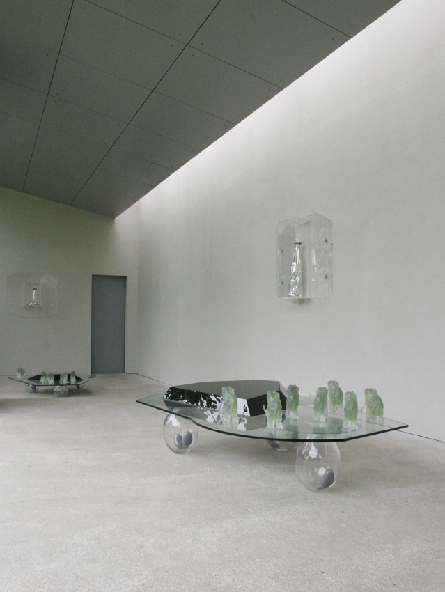 Woodrow and Deacon have been making shared sculptures since 1999. They created most of these ones in 2007, and exhibited them the following year in the shiny corporate halls of London’s Bloomberg Space at the height of the financial crisis. How well they must have played to that context. The original show featured seven tabletop sculptures, one for each day of the week – bizarre, hovering tableaus in which green glass mammoths march over barren obsidian-black plateaus. They resemble chess sets or military models, power games balanced on glass bubbles, ready to crack. A set of ‘Sorcerer’s Bottles’ accompanied them; knotted, snakey, stoppered vessels for some elixir or other (served straight up, or on the rocks, to fuel the fun?)