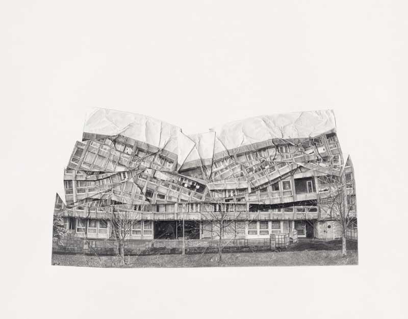 By contrast, Brennan’s piece, entitled A Fall of Ordinariness and Light (The Enabling Power), is restrained, understated and a little disappointing. It is a sequence of four images of a block of flats – Robin Hood Gardens in East London. The building seems to be collapsing, but on closer inspection it turns out that it is the image, not the building, that is being crushed. It is in fact four drawings of a photograph of the building, and it is the photograph that is becoming progressively crumpled.