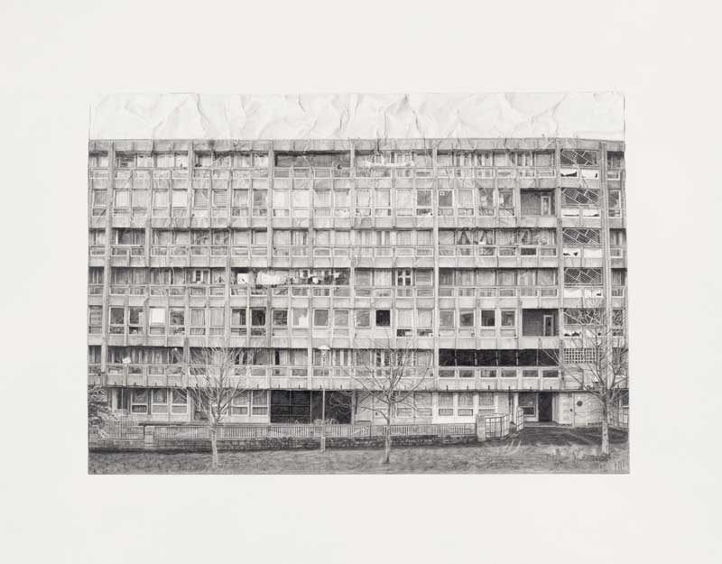 It is understandable that Brennan should wish to chart her own course with this commission, and to create a more subtle observation on the nature of progress. For her, progress is the false utopia that the brutalist housing estate, designed in the late 1960s, once offered, but also the empty promises of improvement and ‘affordability’ contained within current plans for demolition and redevelopment. The layering of media in the work – architecture, photography and drawing – allude to differing standards of truth-telling in image making. Her photo-realist drawings document the human accretions and lived-in condition of the flats that now disrupt the idealised visions of the architects’ designs and the planners’ intentions.