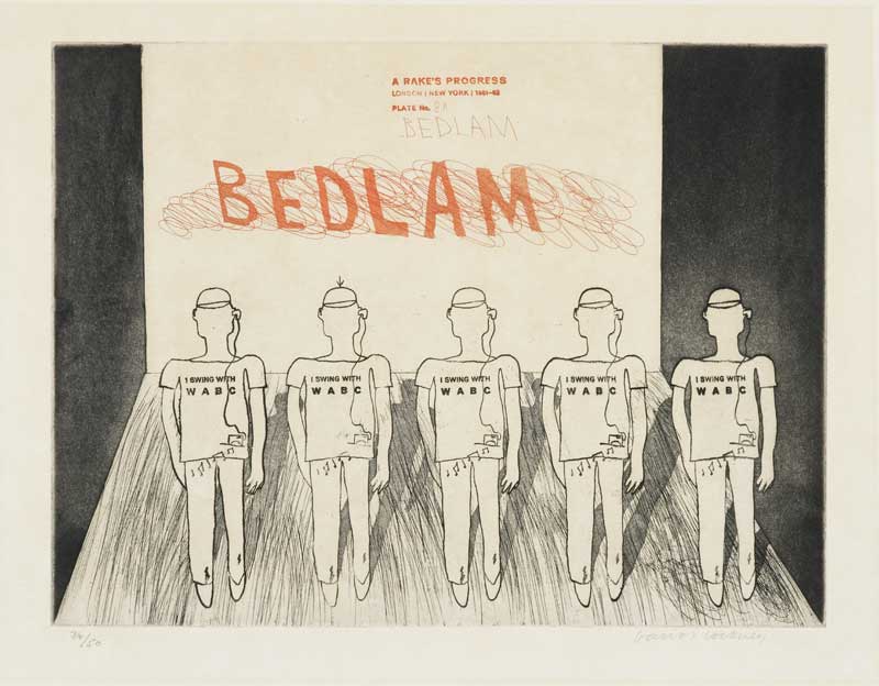 The contemporary responses to Hogarth’s series collectively form their own ‘progress’, providing a shifting set of perspectives on today’s social values. Hockney’s is the most autobiographical, describing the adventures of a callow young artist visiting hedonistic New York for the first time. The progress here is towards a desired loss of innocence, but also towards social conformity.