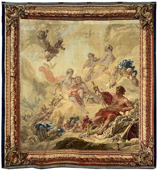 After 20 years experience at Beauvais, François Boucher was appointed head of the Gobelins in 1755. His Venus in the Forge of the Vulcan from the multi-authored Loves of the Gods set commissioned in the late 1750s shows him head and shoulders above his peers Pierre and Vien, although Pierre’s waterfall of infants playing with a dog in the so-called Allegory of Fidelity is quite lovely.