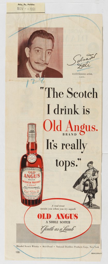 In 1951, he appeared in an advert for Old Angus blended Scotch. In 1958, he created the label artwork for the vintage of Château Mouton Rothschild’s Grand Vin. In 1964, he moved from label to bottle to screen: he designed a special Osborne sherry Conde de Osborne bottle and then fronted an Osborne Veterano brandy advert in 1965, decades before Bill Murray’s character praised ‘Suntory time’ in Lost in Translation (2003). In 1974 Dalí appeared in an Alka-Seltzer advert; he was happy to promote both cause and cure.