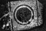 On the gallery wall, Kawada’s shot of a discarded Lucky Strike cigarette packet from The Map is mirrored by a similarly cropped photo of a discarded Japanese flag: both are abandoned and worn, their decay highlighted by the photographs’ intense dark tones, but both still clearly bear their iconic circle motifs. Kawada shot both from above, as the American pilots in the Enola Gay must have observed the city before dropping the bomb. But, being an American product dropped since the explosion, this packet presumably represented for Kawada the lasting cultural consequences of the bomb. The Allied nations occupied Japan up until 1952, and as Kawada was putting The Map together Japan was going through an economic recovery, partly due to trade with America.