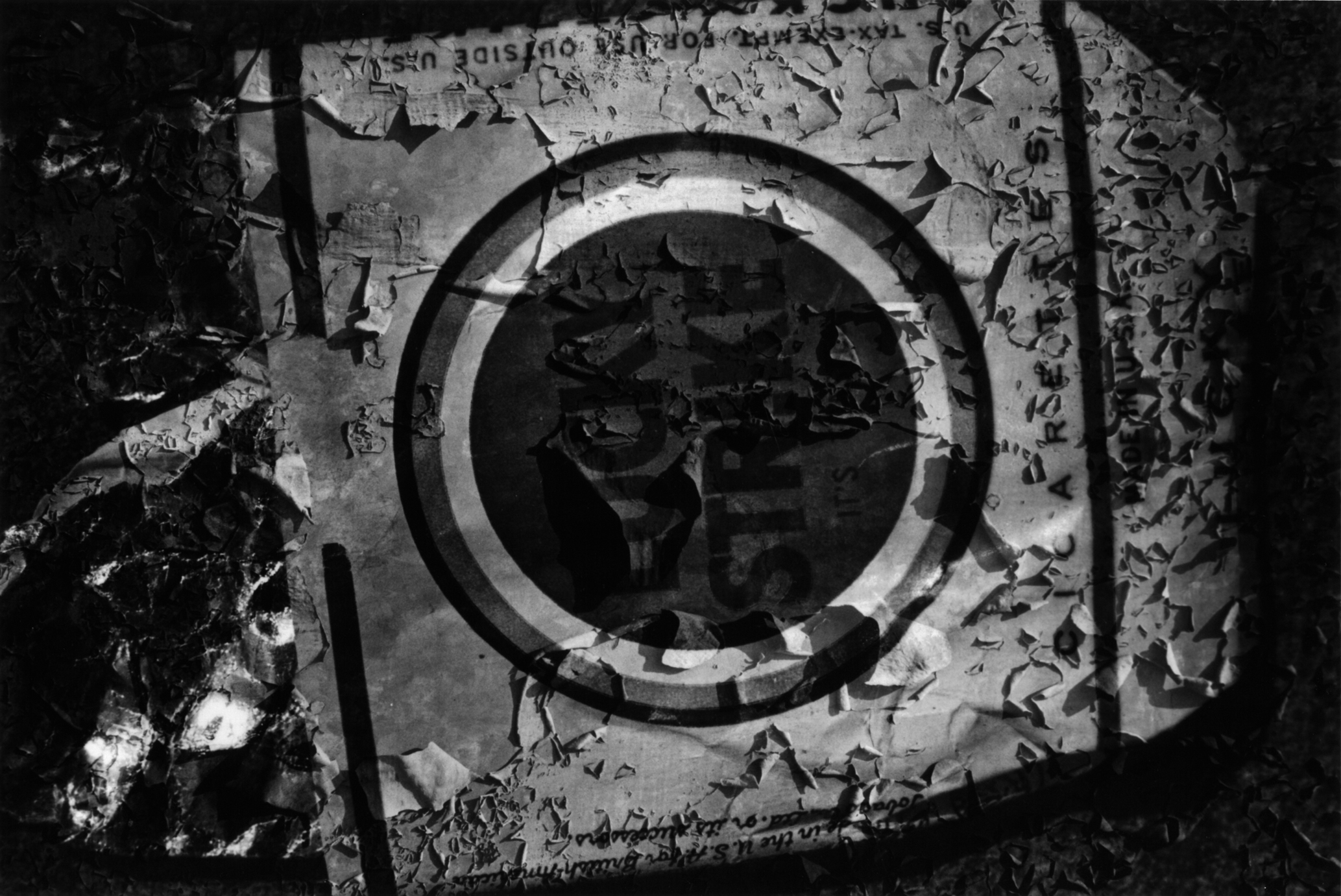 On the gallery wall, Kawada’s shot of a discarded Lucky Strike cigarette packet from The Map is mirrored by a similarly cropped photo of a discarded Japanese flag: both are abandoned and worn, their decay highlighted by the photographs’ intense dark tones, but both still clearly bear their iconic circle motifs. Kawada shot both from above, as the American pilots in the Enola Gay must have observed the city before dropping the bomb. But, being an American product dropped since the explosion, this packet presumably represented for Kawada the lasting cultural consequences of the bomb. The Allied nations occupied Japan up until 1952, and as Kawada was putting The Map together Japan was going through an economic recovery, partly due to trade with America.