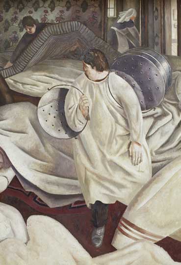 Many of the paintings in the chapel draw directly on his experience at the hospital; the first in the series shows a lorry-load of wounded soldiers arriving at the gates of the Beaufort, which are being swung open by attendants. The perspective is bizarre, almost a premonition of how a CCTV camera might record the scene. You’re forced to crane your neck to get a sense of where you stand as an observer.