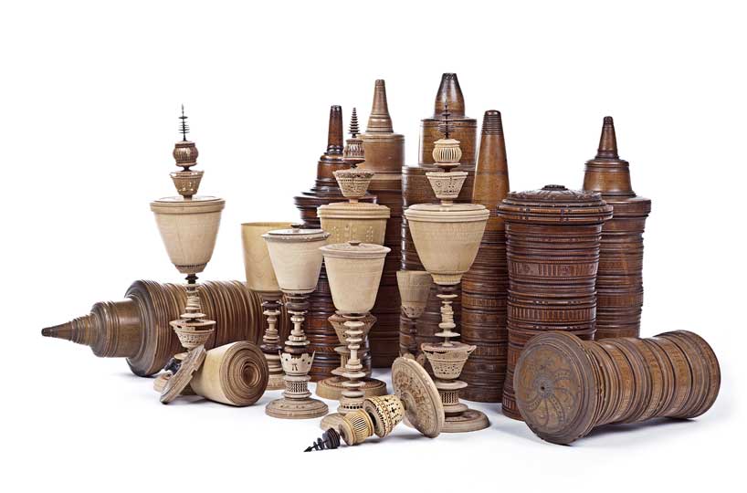 A rare collection of Lignum Vitae ornamentally turned objects by ‘The Tudor Court Turner and his inheritor’, England (late 16th and early 17th century). Porfirius Kunstkammer. Collection John Hawkins