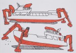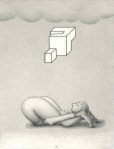This sort of conversational selection process makes for an eclectic mix of drawings, with an air of insider knowledge which plays to the Biennial’s advantage. There’s a definite sense that, pinned up alongside the contributions of some of today’s greatest artists, are the early works of tomorrow’s stars. As we rifle through the drawings, we pause again and again over surprising pieces, even from the old hands. ‘Michael Craig-Martin’, announces Doyle, holding up a neat diagram of a brain in a helmet. Macfarlane takes a look – ‘That’s quite different from Martin isn’t it?’ Nods of assent. Later we come to a Paul Noble drawing of a yoga figure in an impossible pose. ‘It’s hilarious. He phoned me and said “I really don’t know what to draw”‘, Macfarlane laughs. Noble has rarely drawn full figures in recent years, but perhaps he’s on to new things. ‘I think we’ll be seeing that one again’.