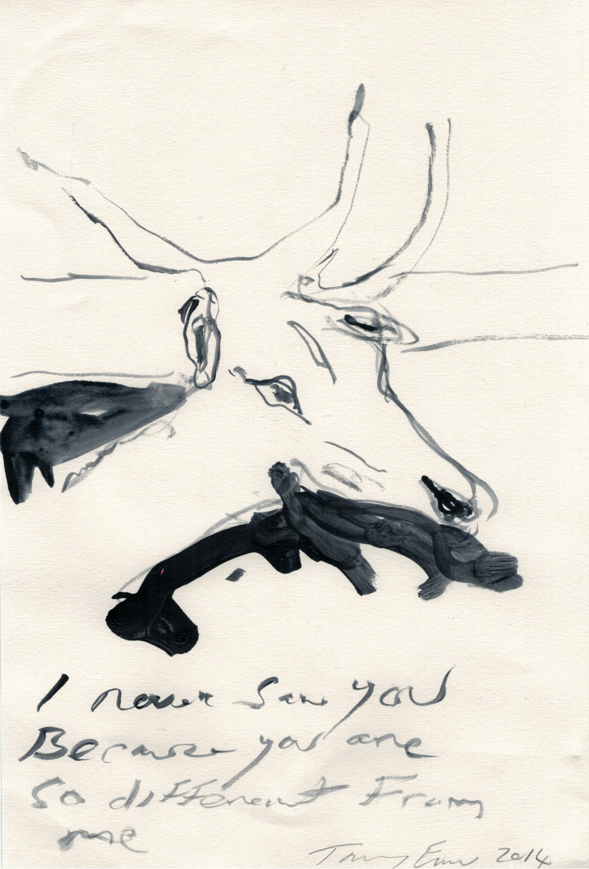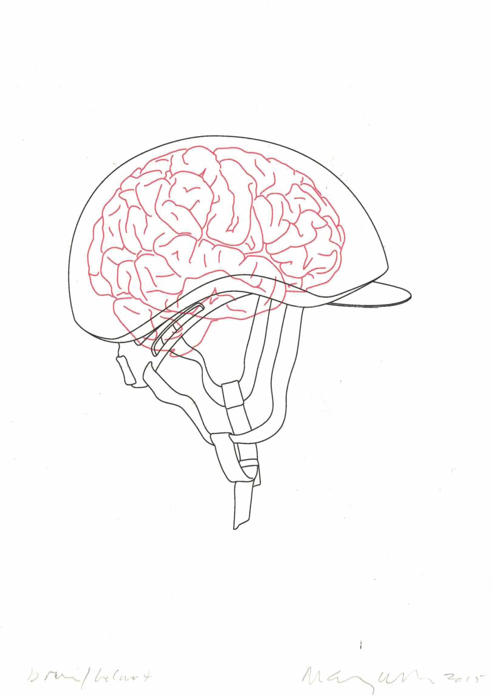 This sort of conversational selection process makes for an eclectic mix of drawings, with an air of insider knowledge which plays to the Biennial’s advantage. There’s a definite sense that, pinned up alongside the contributions of some of today’s greatest artists, are the early works of tomorrow’s stars. As we rifle through the drawings, we pause again and again over surprising pieces, even from the old hands. ‘Michael Craig-Martin’, announces Doyle, holding up a neat diagram of a brain in a helmet. Macfarlane takes a look – ‘That’s quite different from Martin isn’t it?’ Nods of assent. Later we come to a Paul Noble drawing of a yoga figure in an impossible pose. ‘It’s hilarious. He phoned me and said “I really don’t know what to draw”‘, Macfarlane laughs. Noble has rarely drawn full figures in recent years, but perhaps he’s on to new things. ‘I think we’ll be seeing that one again’.