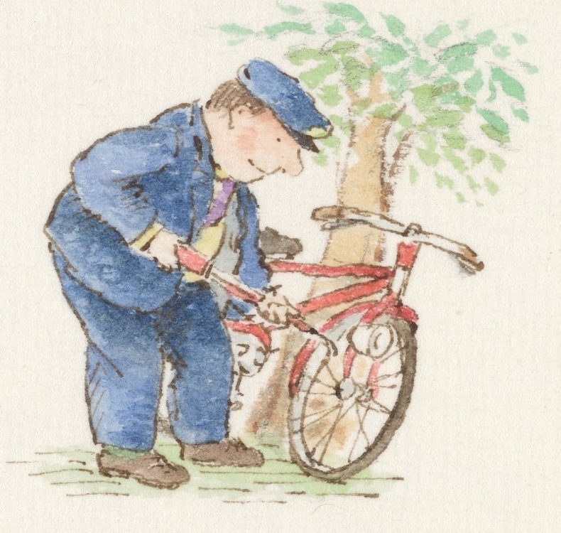 Watercolour of The Jolly Postman and his Bicycle, by Janet Ahlberg. © Janet and Allan Ahlberg