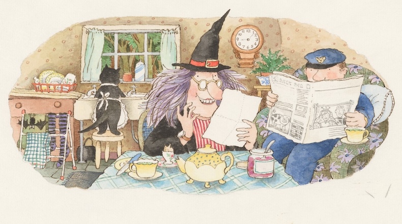 Allan Ahlberg, who died last year, once decreed that a successful children’s book was a ‘marriage of words and pictures’, and it is clear from the material displayed here that he and Janet were an incomparable personal and professional partnership. Arguably, he never scaled the same heights alone. She was an illustrator; he was a teacher. Between 1976 and Janet’s premature death in 1994, they co-created 37 children’s books, all of which root Allan’s sharp humour in Janet’s charming and instantly recognisable visual world. In The Jolly Postman, as in their breakthrough, Each Peach Pear Plum (1978), she creates a gently fantastical vision of the English countryside, the dreamy turrets of Cinderella’s castle offset by the church spire over the crest of the adjacent hill. Two cows are in the field; one is jumping over the moon. The scumbled blue sky is darkening, but apparently there is an Army & Navy around the corner, since Janet poured through their catalogue for source material, and subtly delineates her characters through teacups. The Three Bears favour sturdy white mugs with green stripes; the Wolf appropriates the classic Cornishware of Red Riding Hood’s Grandma, and the more fanciful Witch, with her purple hair in her bijou gingerbread cottage, serves an unappetising green concoction from a yellow, pot-bellied teapot with scalloped cups and matching saucer.