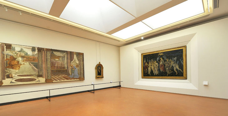 View of The Annuniciation of San Martino alla Scala (1481), and the Primavera (c. 1482), in the rehung Botticelli rooms at the Uffizi