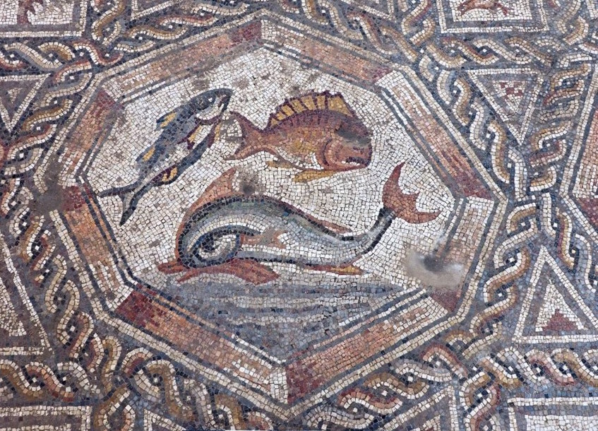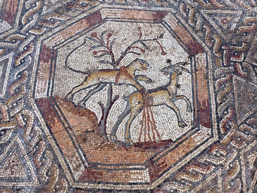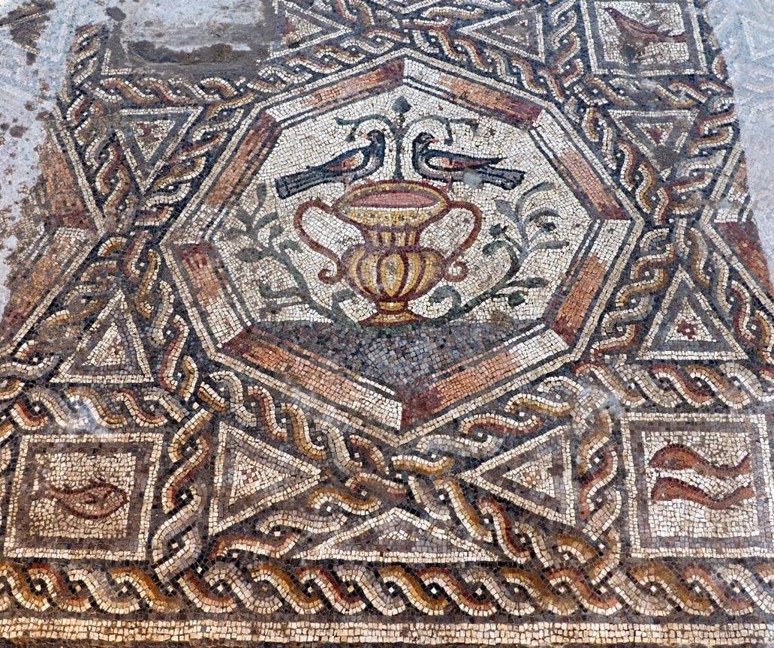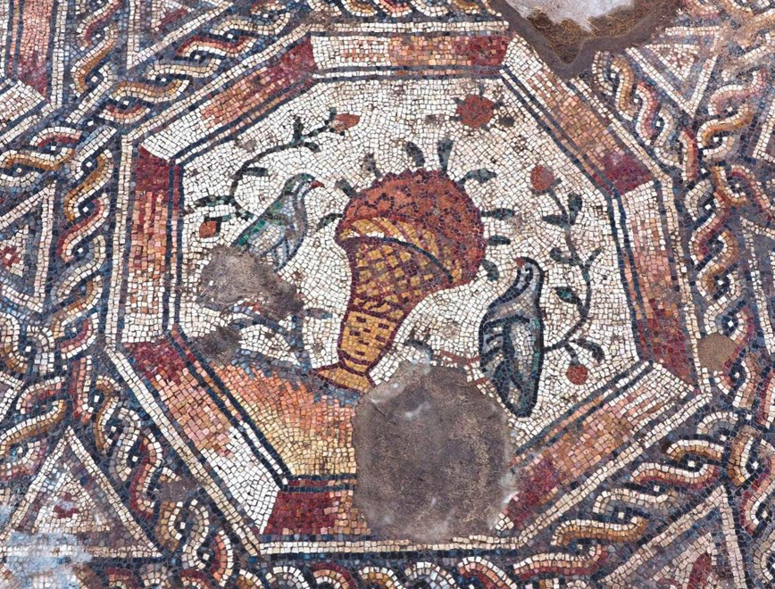 It’s a very rich, late Roman work, composed of rectangular concentric frames. Inside are nine medallions, octagonal in shape: five of these depict animals fighting or hunting; two depict fish, showing species from the Mediterranean Sea; and two others reveal birds – doves and partridges beside objects, including an amphora and a basket of flowers. Based on the ceramic shards found during the excavation, and on numismatic – as well as artistic – grounds, we have dated it to the 3rd century. This mosaic is the best of the Roman tradition.