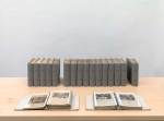 Although collectively entitled Today, the date paintings have also been displayed in groupings under other titles at different times. Everyday Meditation, a series of consecutive and equally sized date paintings from the beginning of 1970, curve like a grey spine along the lower circles of the Guggenheim rotunda. They constitute the longest uninterrupted spate of date paintings, covering three months from January to March. A vitrine runs underneath, housing the individual containers that Kawara crafted for each painting from cardboard, which are lined with a sheet of that day’s newspaper from whichever city or country Kawara was in at the time.