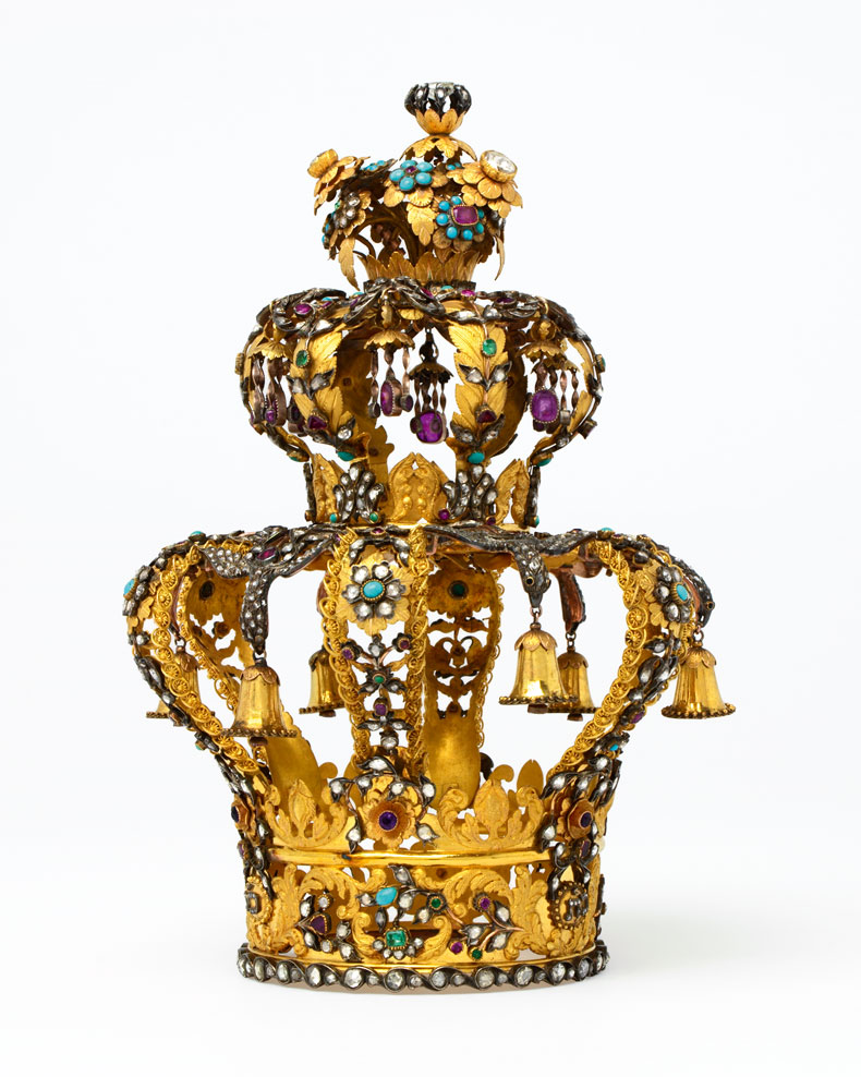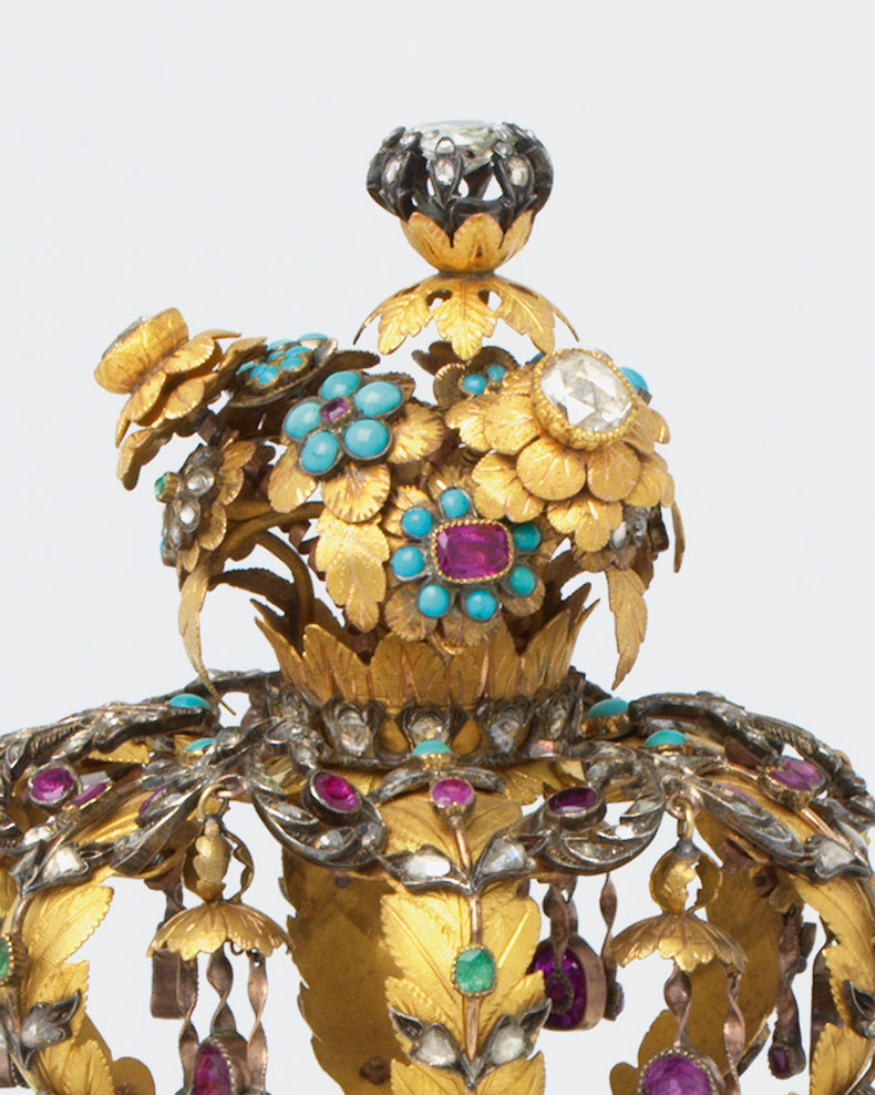 A simple gold rim reinforces the top of the base and joins it with the rest of the crown. Rising up from it are the branches, which are made of gold filigree, shaped and soldered on. The same goes for the foliated designs between the branches, soldered and bolted to the rim of the base. Then jewels have been set: diamonds, rubies, emeralds, turquoise and amethysts. The rubies and emeralds have been backed by foil in the setting, to enhance their colour and luminosity; some of the rubies have a milky appearance, suggesting that they were mined in what is now Myanmar.