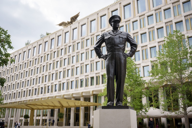 A statue of Dwight Eisenhower standing in front of Eero Saarinen’s former US embassy building, now the Chancery Rosewood hotel, photographed in 2025. Photo Richard Baker/In Pictures via Getty Images