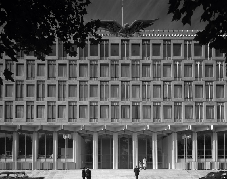 More cheerfully, Malchow also catalogues some of the cultural attractions offered by the embassy in its early years: free lectures and films; performances by Met Opera singers and the Cornell University Glee Club. Nairn mentions an art gallery and library. This era of openness was not to last. Security had always been part of the embassy’s design – which included a glacis running around the edge of the site as a defensive measure. But after a series of terrorist attacks against US embassies in the 1980s and ’90s, the State Department issued new guidelines for its overseas facilities. The urgency of these measures increased after 11 September 2001.