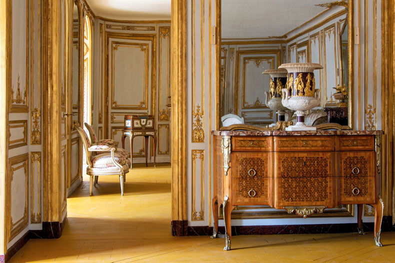 Perhaps the most charming space in these appartements privés is a petite octagonal room named the Méridienne after the daybed occupying a mirror-clad alcove on one side. As with the Gold Room nearby, the design of this boudoir was entrusted to the architect Richard Mique. Exquisite gilt ornamentation by the Rousseau brothers celebrates the union of Marie Antoinette and Louis XVI with pierced hearts, Cupid’s bows, rose petals, Jupiter’s eagle and Juno’s peacock; the queen was pregnant with her second child, and gilt dolphins – the symbol of a dauphin – were a not-so-subtle hint at the hoped-for male heir. Luckily, things turned out as forecast on that front, and Marie Antoinette gave birth to a boy one month after the room was finished. This latest restoration has recreated the original lilac-coloured gros de Tours swathed around the alcove and the window, and covering the seating. The trimmings alone are fit for a queen.