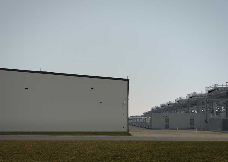While I was watching Farm (Pryor Creek, Oklahoma) (2015), one of two recent works by John Gerrard currently on show at Thomas Dane Gallery, the other person I was sharing the gallery with wandered over to the screen and put their nose right up against the projected image. This was an urge I also had; getting up close might shed some light on what I was watching. In the work, a camera inches 360 degrees around what appears to be an industrial plant, all silver diagonals and rounded cooling towers. The building sits heavy in a vast flat landscape, and if it were not for the camera’s gentle pan I’d have guessed that the work was made up of artfully staged photographs, each one subtly different from the last. In fact it is neither a video nor a photograph: Gerrard’s film is a simulation made of real-time computer graphics. As a study in hyperreality, it’s utterly unnerving.