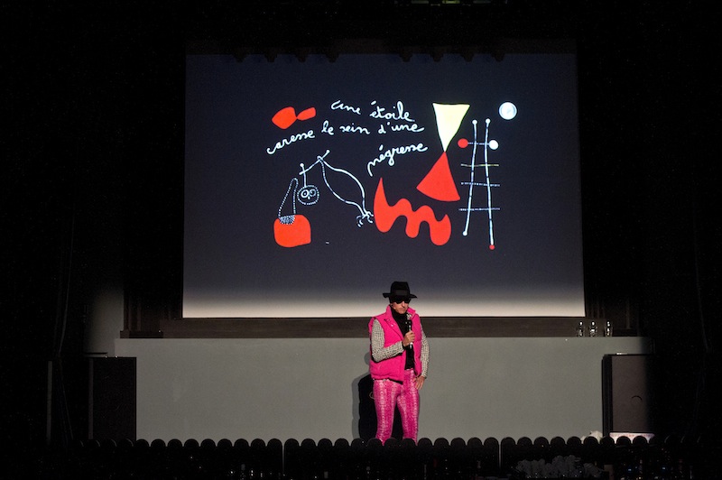 Once the crowd had settled into the plush banquettes of the historic Razzia restaurant, one of Zurich’s first theatres, the hubbub rose to a fever pitch – only to be silenced as Punyet Miró – wearing skin-tight luminescent pink snakeskin leggings, a pink padded gilet and wrap-around sunglasses – rode into the theatre on a black Harley-Davidson to the strains of Steppenwolf’s Born to Be Wild. Ascending the stage, he spent the next 20 minutes giving a performance that combined anecdotes about his grandfather’s life with gunshots and occasional nudity.