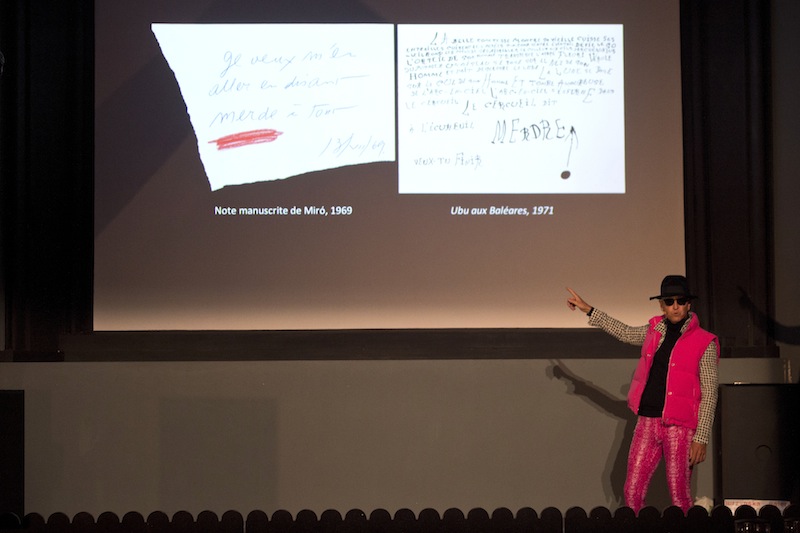A PowerPoint presentation with images from Miró’s trip to Japan, family photos, and recordings of the artist’s destruction of his own canvases during the 1970s were interspersed with Punyet Miró mourning the disappearance of risk from the art world. Occasionally, he fired a gun into the crowd to liven things up. At some point – I later found out it was in homage to Miró’s 1938 work, A Star Caresses the Breast of a Negress (Painting Poem), a recreation of which formed the backdrop to the performance – a bare-breasted black woman appeared on stage, stood silently for a while, and then left. As a final highlight, Punyet Miró stripped naked under black lighting and flung paint at both A Star Caresses the Breast of a Negress (Painting Poem) and himself. Stunned into silence, the audience nevertheless applauded, before tucking into dinner.