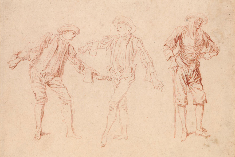 Elegance is a word that is often used when discussing Watteau, as though it is easier to appreciate the surface of his Fêtes galantes paintings than enter their ambiguous atmosphere. The ambiguity is, of course, present in his drawings too. In a witty curatorial conceit, drawings of standing soldiers and of dancers were placed next to each other. The figure on the right of the sheet with the dancers is holding a crutch that points to the ground. Is he, perhaps beating time for the dance? At first glance it could appear to be a long sword. The leg of the middle soldier might be about to flick into a contredanse. The figures might be mistaken for the same type of subject, soldier to dancer and back again. This is another way of saying that violence and pleasure are never far apart in Watteau’s world.