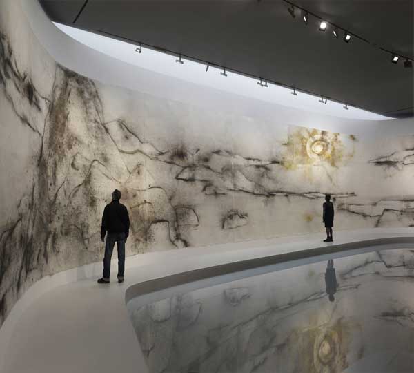Nonetheless, step inside the Whitworth since its £15 million transformation by MUMA architects, and you’ll find more than just absent fireplaces. Upstairs you’re surrounded by Tits in Space, a wallpaper designed by Sarah Lucas and soon to be seen in every Mancunian sitting room. A permanent installation by David Batchelor entitled Plato’s Disco casts spinning coloured lights above a stone-handled staircase. Cai Gio-Qiang has smeared gallery walls with gunpowder dust and dug a pond in the floor; outside, a sea of mud and stranded construction equipment stand in for a future art garden. At the heart of the newly restored exhibition halls, Cornelia Parker’s exploded shed Cold Dark Matter: An Exploded View (1991) hovers in suspended animation, as if ready to clatter to the floor.